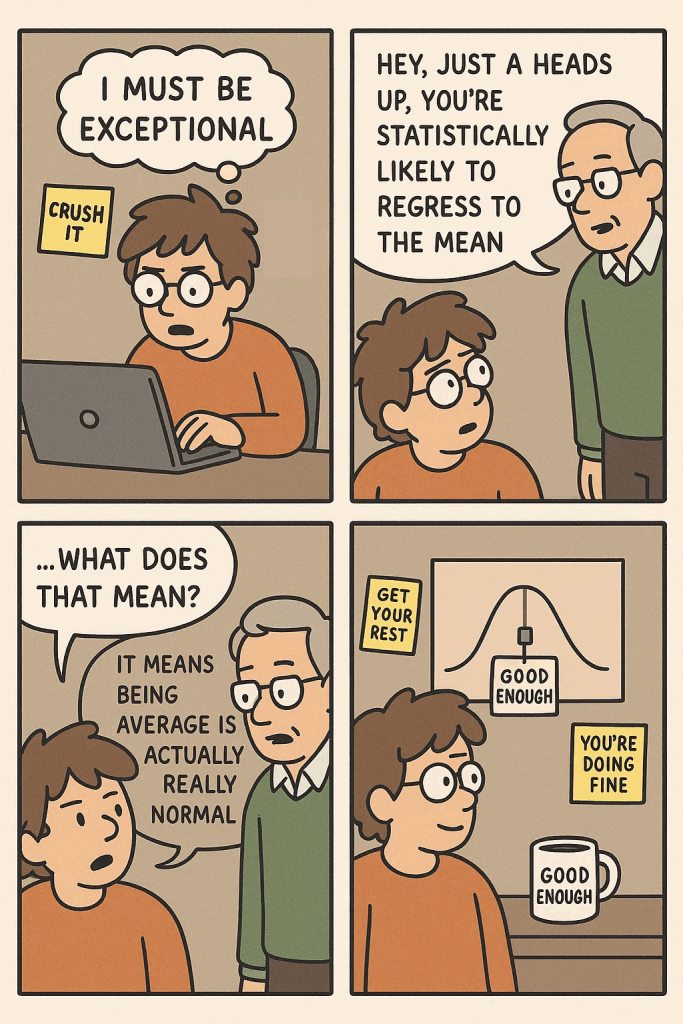 Now, before we delve deeper into burnout or the even weirder ‘fizzle out’, I’m telling you right now to permit yourself to be ‘average’ because statistically speaking, most of us are ‘average’. And if you can’t cope with the phrase ‘average’, then try accepting that ‘good enough’ is indeed ‘good enough’. There’s a real push to be ‘exceptional’ these days, but within that word is ‘exception’, which means you are at the 1% tail end of that famous bell-shaped curve.